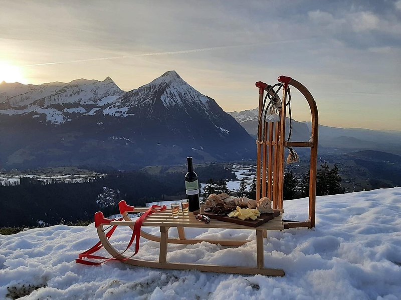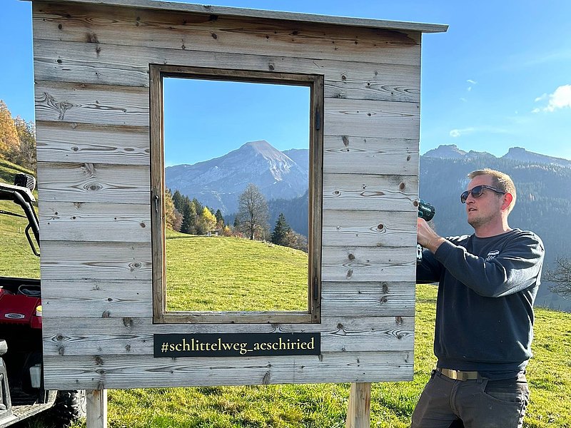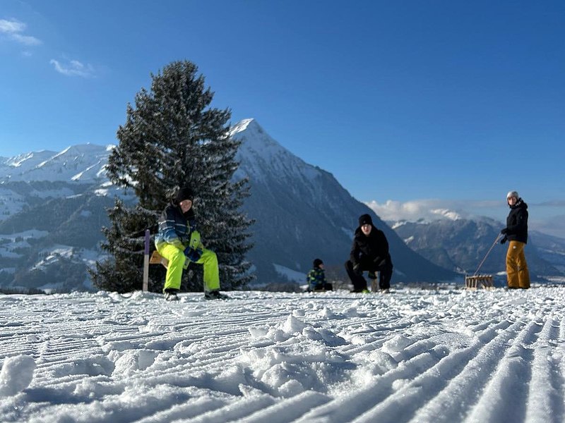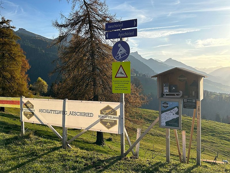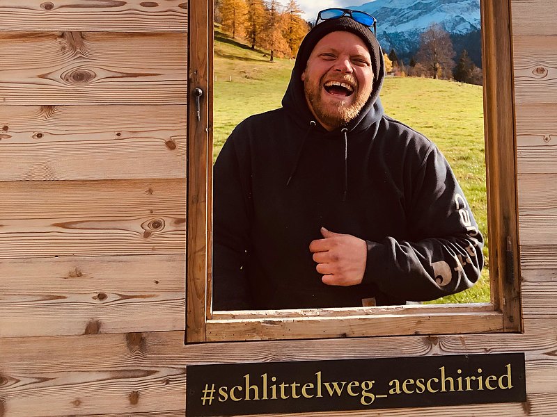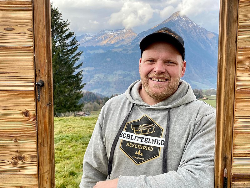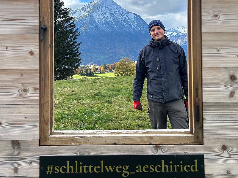 Vor dem Saisonbeginn legen sie in Fronarbeit und mit viel persönlichem Engagement den Grundstein für ein tolles, weiteres Wintersportangebot in Aeschi. Sie müssen die Strecke vorbereiten, entfernen Äste, sichern die Route mit Abschrankungen, stellen das Gondeli, Zäune und Schilder. Zudem montieren sie die Kässeli (das Benutzen des Schlittelwegs ist kostenlos, daher darf gerne, wer will, etwas ins Kässeli legen). Dafür benötigen die beiden Freunde zwei Samstage. Was also als Idee unter Freunden begann, ist heute fester Bestandteil des Wintererlebnisses in Aeschiried und zeigt wunderbar auf, wie gut Aeschi als Dorf funktioniert. Der Startpunkt liegt idyllisch – nur zu Fuss erreichbar –, dafür wird man oben mit einer herrlichen Aussicht über den Thunersee, das Kandertal und die umliegenden Gipfel belohnt.