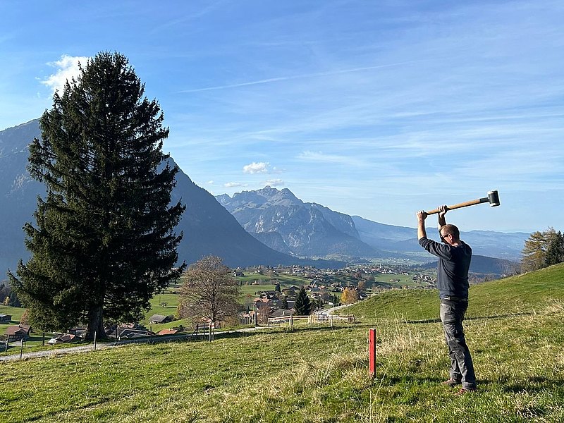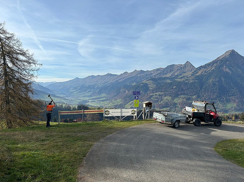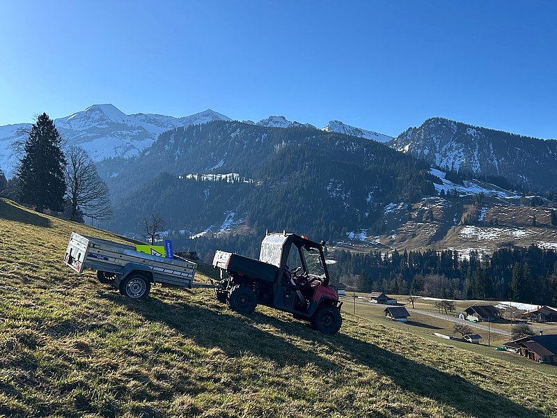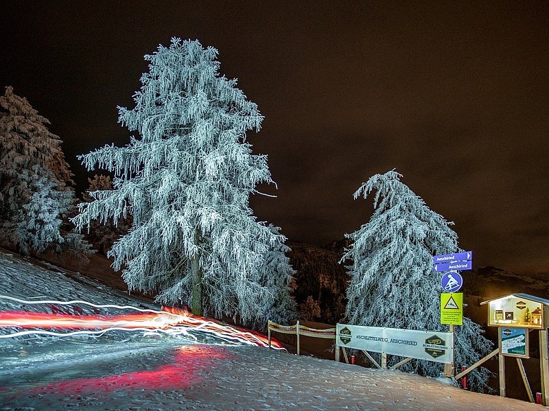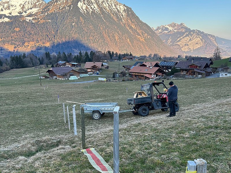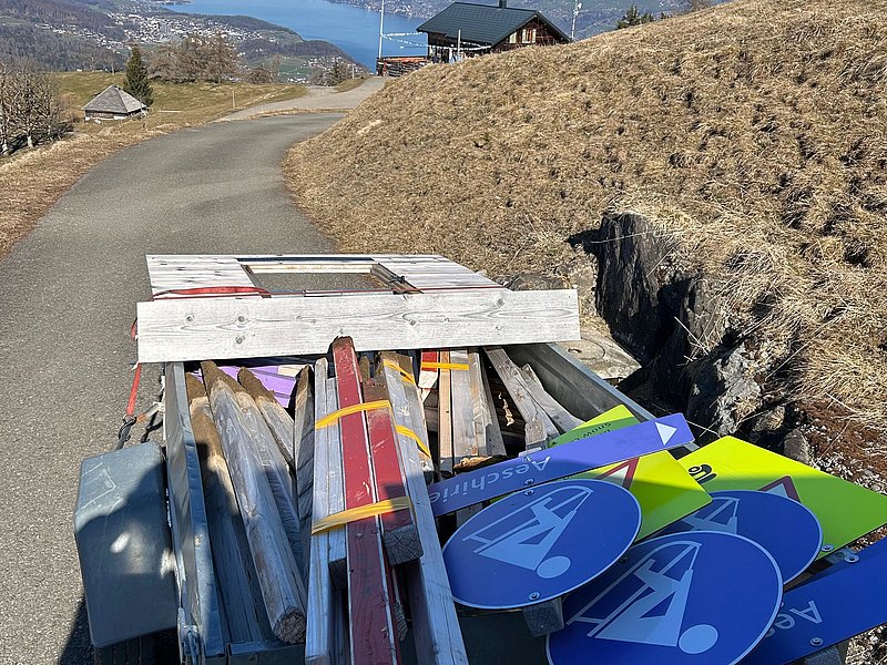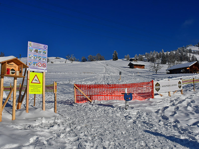 Vor dem Saisonbeginn legen sie in Fronarbeit und mit viel persönlichem Engagement den Grundstein für ein tolles, weiteres Wintersportangebot in Aeschi. Sie müssen die Strecke vorbereiten, entfernen Äste, sichern die Route mit Abschrankungen, stellen das Gondeli, Zäune und Schilder. Zudem montieren sie die Kässeli (das Benutzen des Schlittelwegs ist kostenlos, daher darf gerne, wer will, etwas ins Kässeli legen). Dafür benötigen die beiden Freunde zwei Samstage. Was also als Idee unter Freunden begann, ist heute fester Bestandteil des Wintererlebnisses in Aeschiried und zeigt wunderbar auf, wie gut Aeschi als Dorf funktioniert. Der Startpunkt liegt idyllisch – nur zu Fuss erreichbar –, dafür wird man oben mit einer herrlichen Aussicht über den Thunersee, das Kandertal und die umliegenden Gipfel belohnt.