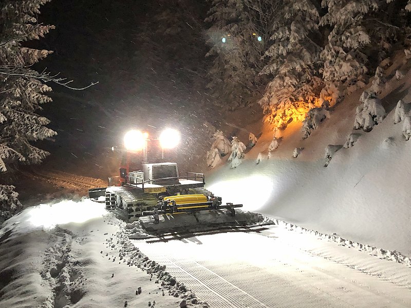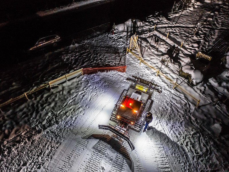 "Äs chunt kinä ds churz" sagen die beiden und lachen, auf die Frage, wie sie sich die Abend- und Nachtdienste zum Pistnen aufgeteilt haben. Beide kennen sich zwar mit grösseren Maschinen und Fahrzeugen aus, technisch gesehen war das also kein Problem. Aber um die Schneeverhältnisse richtig einschätzen zu können meinen sie: "das himer bi dä erschtä Mal o net gad so gnau gwüsst, grad wils denn grägnet het ka, u dr Schnee pflätschnassä isch gsi- da himer o hin un här gsindet, ob mä itz da dri giit oder net. Mir hi du d Pistner vo dä Skiliftä gfragt, wi si albä ä Sach hi bi so Verhältnis u de himer ifach chli usprobiert u mit dr Zit het mä de dus ka, wenn mä wiä cha ga drückä. O das mit dä Temperaturi u wes Nüischnee het gä, obdä gschider am Abä giisch oder am Morgä wes herter isch" erzählt Chlöis- unterdessen besitzen die beiden einen neueren Pistenbully, welcher dem Schlittelweg gehört. Auch heute sprechen sich die beiden ab, wenn nicht ganz klar ist, ob und wann pischtnet werden soll. Auf der Höhe von Aeschiried wartet man aber auch nicht auf die "richtige" Schneemenge. Hier, wo manchmal kaum oder nur wenig Schnee liegt, präpariert man einfach mal "bises neme giit". Es braucht aber schon ein Minimum Schnee. Ab der Strasse sind es ca. 10-15cm,"dert giits relativ gli iis" meint Chlöis. "Ufm Land bruchts öpä 20cm, je nach däm obs gfrorä isch oder net". Durchschnittlich sind die beiden pro Abend 2-3 Stunden unterwegs. "Grössäornig zwüschä sägs u acht giisch öpä, das variert o ging ä chli". U wes schniit ir Nacht, giisch öpä am Morgä". meint Chlöis, dessen Lieblingsplatz "im Winter uf dr Allmi isch, we alls richtig verschniit isch, aber äs git si überall di schönä Ortä ds Aeschi u das zu jeder Jahreszit, mi mues ifach numä usi id Natur u scho gsehtmä viel schöns".