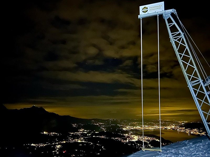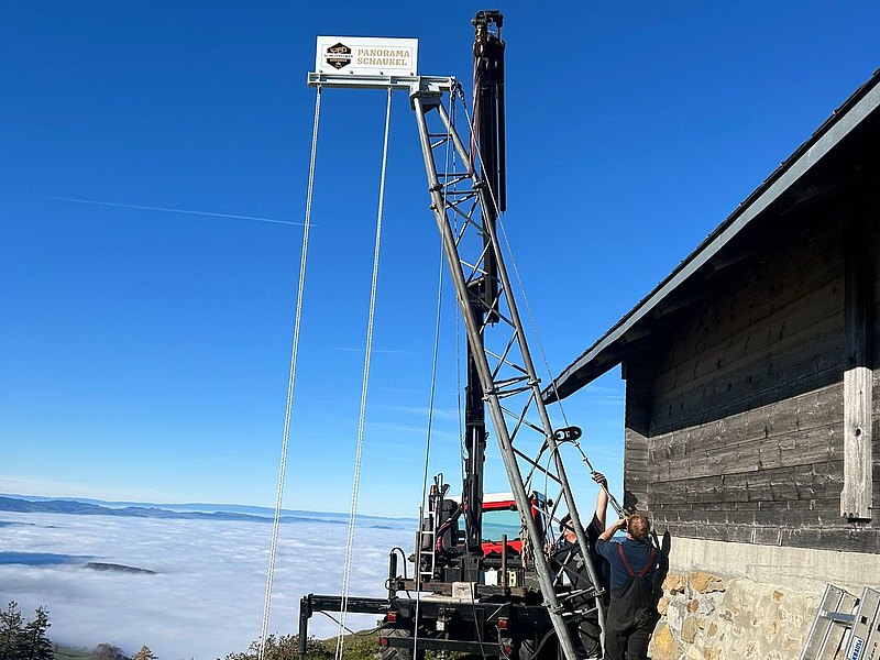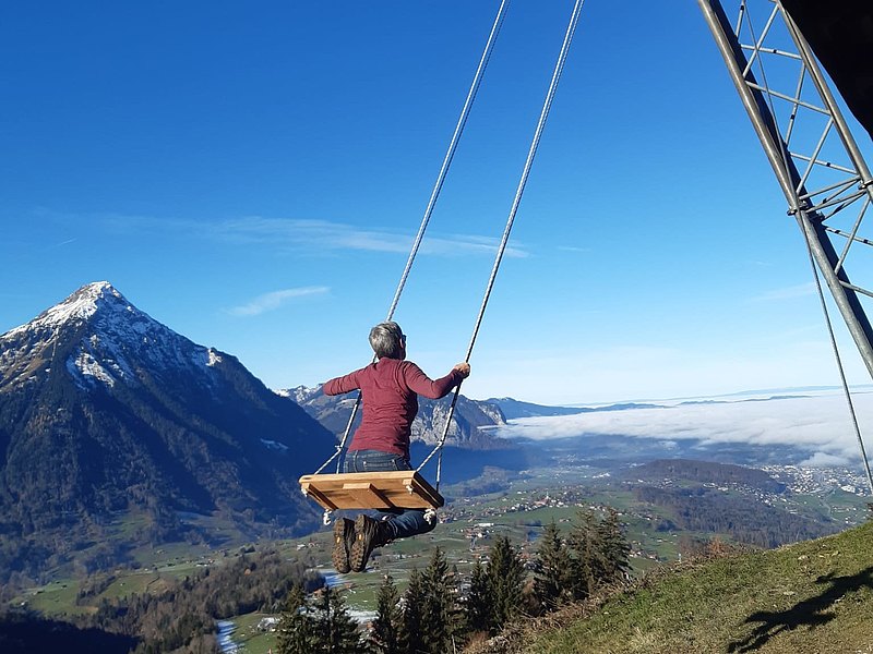 Die Panoramaschaukel, das Gondeli und der Panorama-Bilderrahmen sind ebenfalls gemeinsame Ideen von Lenz und Chlöis. Mit dem Gondeli und dem Bilderrahmen und neu jetzt eben auch mit der Panoramschaukel, haben wir eine Art "Belohnung" für die Besucher unterwegs. Lenz erzählt: "De simer iis da obnä gstandä u hii denkt, mol irgendöpis söti mä doch nu machä für d Lüt, ä Schouklä oder so we no cool. Das si äbä gad ganz uechi luufä". U Chlöis ergenzt: "Mir hiis du no iis äs Jahr, zwü Jahr la ruhiä. Zerscht het mä gugget für mits im Land zämä mitmä Statiker, aber das we de viel ds tür cho. U när het mäs umi lasi. Speter irgendiis im Summer simer zum Schatthuus u hi gsiit, hiä wer ja scho Beton, das we doch dr richtig Ort fürnä Schouklä. De wes amnä Gebäude, de fallts o viel weniger uf u stört net so fescht. När isch de umi schnäll gangä, mir hi gugget miter Gmiind, mitm Landbsitzer u Pächter. Äs si aller iverschtandä gsi u de himer gwüsst mir chönä afä mit däm Konstrukt" erinnert sich Chlöis. Damit das ganze auch verhet"hi mir grob gnuä dimensioniert" ergänzt Lenz. Lenz, der mit Schweissen bereits Erfahrung hatte und beide Freunde handwerklich begabt, bekamen nach getaner Arbeit sogar von Berufsschlossern Komplimente für die saubere Verarbeitung. Lenz meint, "wemä öpis macht, wot mäs ja o richtig machä". Chlöis meint: "äs isch ds coolschtä gsi, womer si druf ghoket u hi gmerkt, ah mol, das het u hi änander agä u de si scho di erstä Touristä cho hi sig o uf d Schouklä gsezt u hi schier güüset vor Früüd. Da hi mir o u Früüd ka, ds Wärchzüg isch no net mal wäggrumt gsi", erinnern sich die beiden.