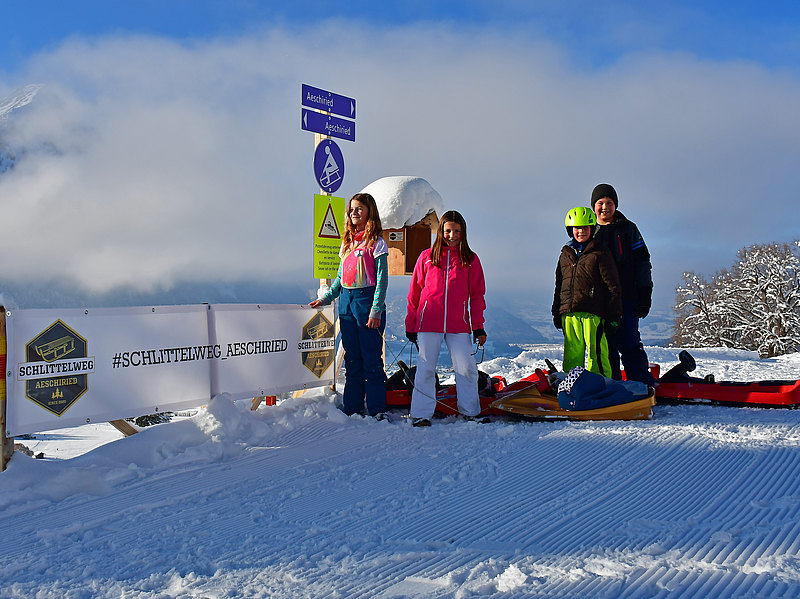 Die Geschichte des Schlittelwegs Aeschiried beginnt an einem Winterabend mit zwei jungen Aeschiriedern auf der Terrasse der Skihütte Aeschiallmend. Die Skilifte wegen zu wenig Schnee nicht in Betrieb und zugleich viele winter- und wintersportbegeisterte Menschen in Aeschiried und in der Skihütte, zudem Lüt wo si cho giblä- ifach ohni Pischtä, da musste etwas her, da muesmä doch öpis machä, sagten sich Chlöis u Lenz. Etwas, das auch mit wenig Schnee zum Wintersportmachen einladen soll. Etwas was sich mit der Skihütte Aeschiried ergänzen und an den Skipisten vorbei bewerkstelligen lassen sollte. Wie es der Zufall wollte, durfte Chlöis damals einen alten Pistenbully sein eigen nennen. Nachdem iis u iis si grächnet gsi isch d Idee fürnä Schlittelwäg ds Aeschiried geborä gsi. Ein Schlittelweg der nicht nur Spass macht sondern die wunderbare Landschaft in Szene setzen und welcher am Ausgangspunkt- beim Parkplatz in Aeschiried- enden sollte. So wurde rasch klar, dass die Piste über d Schiitmatti mues achi füehrä. Zudem musste die Skipiste umgangen werden.