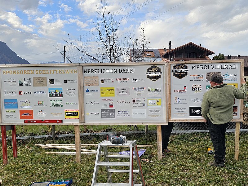 Vor dem Saisonbeginn legen sie in Fronarbeit und mit viel persönlichem Engagement den Grundstein für ein tolles, weiteres Wintersportangebot in Aeschi. Sie müssen die Strecke vorbereiten, entfernen Äste, sichern die Route mit Abschrankungen, stellen das Gondeli, Zäune und Schilder. Zudem montieren sie die Kässeli (das Benutzen des Schlittelwegs ist kostenlos, daher darf gerne, wer will, etwas ins Kässeli legen). Dafür benötigen die beiden Freunde zwei Samstage. Was also als Idee unter Freunden begann, ist heute fester Bestandteil des Wintererlebnisses in Aeschiried. Der Startpunkt liegt idyllisch – nur zu Fuss erreichbar –, dafür wird man oben mit einer herrlichen Aussicht über den Thunersee, das Kandertal und die umliegenden Gipfel belohnt.